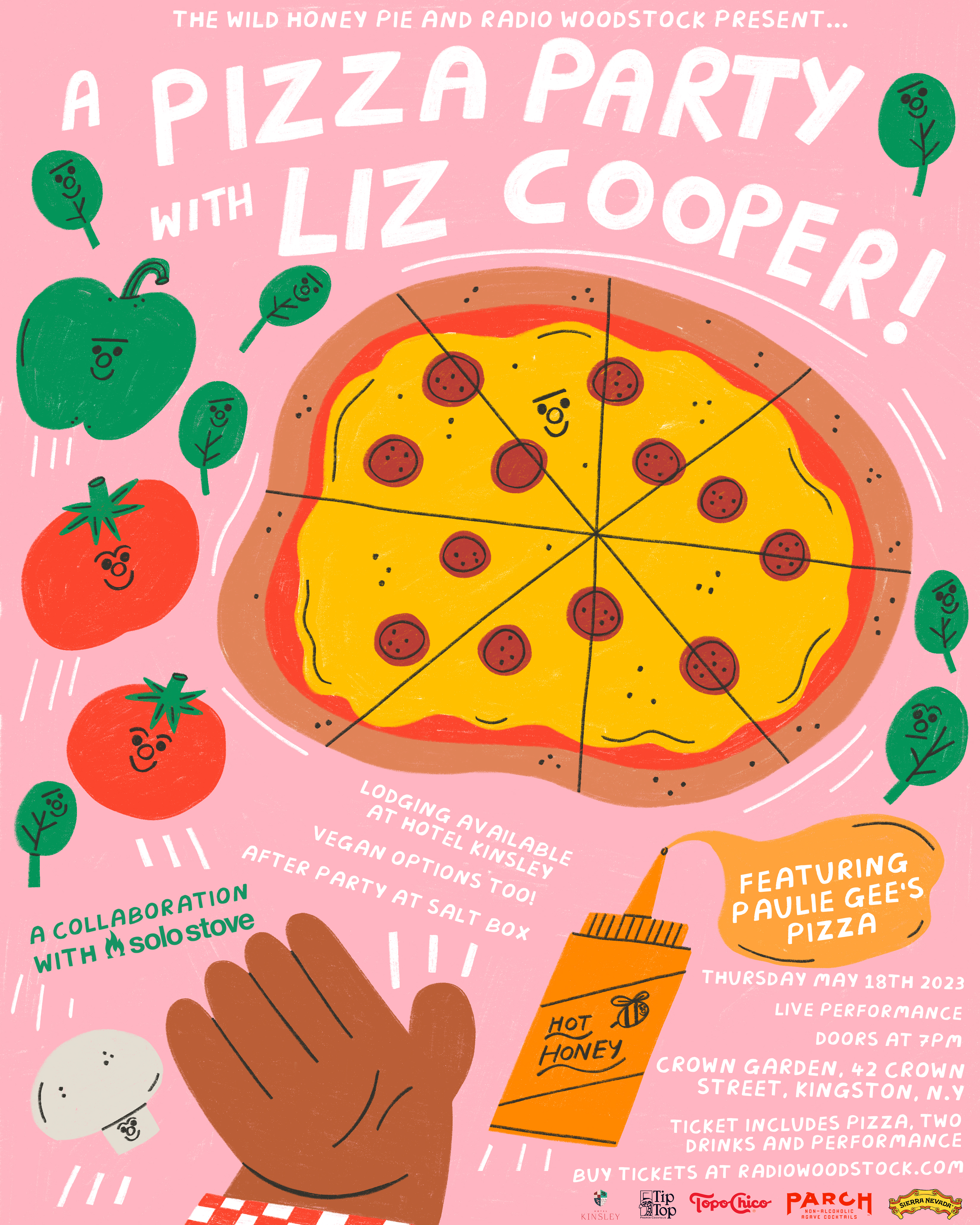 A poster and two menus for an event in Upsate NY, with The Wild Honey Pie and Radio Woodstock